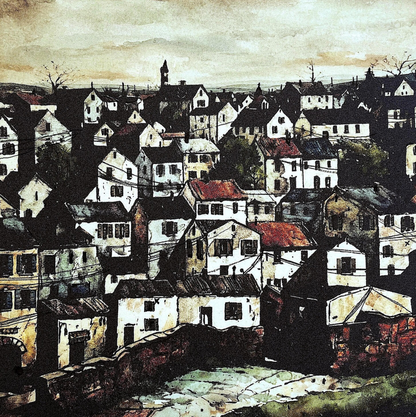 The work brings an undisclosed narrative within the streets below our viewing position. No residents can be seen, partly because of the random, crowded oppression of the buildings. But very many stories undoubtedly have happened and are happening. After the houses were drawn, I wanted add another layer to the oppresiveness - hence the chaotic power-lines criss-crossing the higher level which I feel act like a net, trapping those below. To my mind, this sense of subtle imprisonment is the primary theme of the work, hence the title. A tower on the horizon and a few trees escape this.