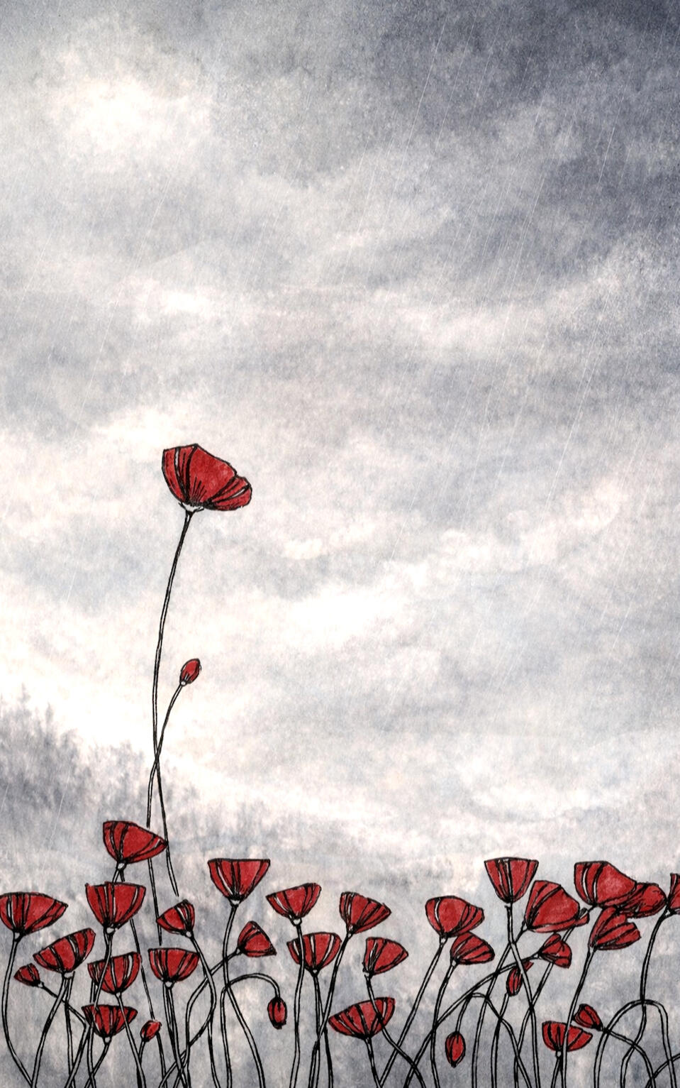 I have a collection of notebooks dating back decades in which I write and draw stuff. In one of these, I found a drawing of some poppies which I had done for no appreciable reason other than they looked collectively both sad and knowing. Last Remembrance Day, I vowed to turn the image into something a bit more formal and this is the result.