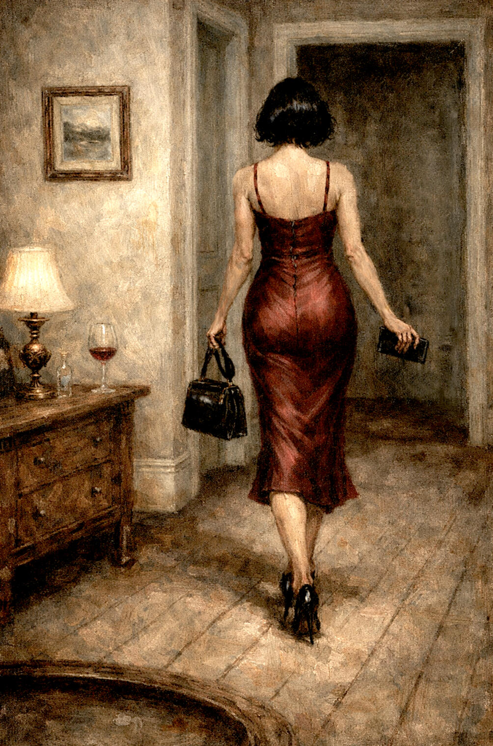 In this work, I wanted some shine so I could do reflections, but also wanted it to look old and damaged, in the sense that it had witnessed everything possible. I was really happy with the way her hand falls - in an unusual gesture - on the electronic device, suggesting her interaction with it has a narrative of sorts.