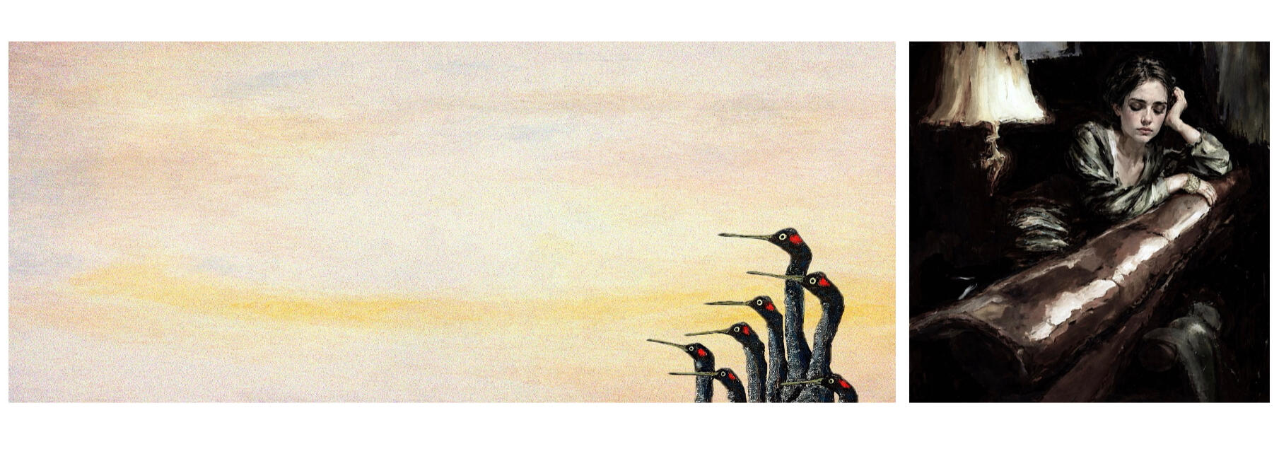 The inspiration for this work came from a fairly well-circulated Japanese meme image of cranes looking sideways. However, as you can see from some of my other works, I am fascinated by wide empty space and how this can create unanswered questions about nature and epistemological philosophy. I set about creating a group of quasi-cartoonish birds (species unspecified) who look to be somewhere between baffled and aware of something we can't see - perhaps something numinous or extra-worldly. I thought of putting a Space Odyssey obelisk far left but then decided that would be over-egging things. Indeed, the power of the scene probably comes from the vast unexplained emptiness on the left that yet manages to occupy the flock - they see what we can't.