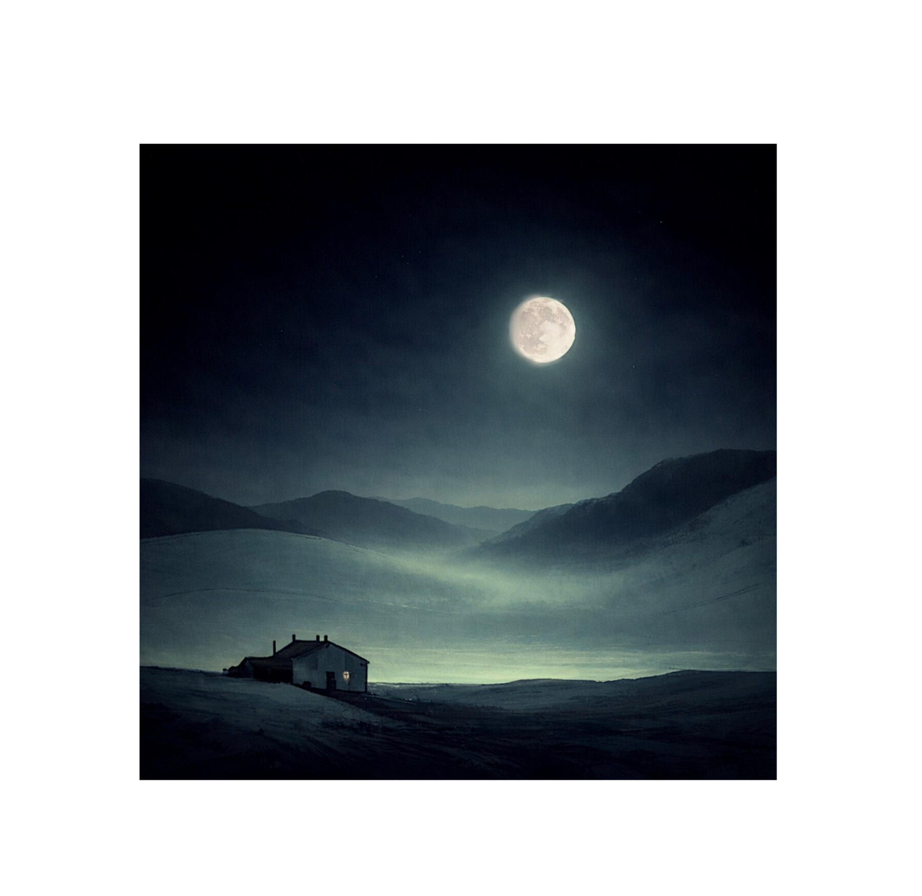 During a recent visit to the north of Scotland, I was struck by the way in which cold and dark accentuate loneliness, be it of solitary individuals or inanimate artefacts. I had been working on a quite flat impressionist oil painting of the moon in a blue landscape setting so set about reworking that into something highly atmospheric, cold, misty, monotone and the rest of it. Eventually, it evolved into this image which makes the moon and house into lonely night-fellows. The sense of velvety physical silence comes through, I think; and hopefully a tiny chink of orange light optimism from within the house - kept as low-key as possible so as not to disturb the cold mood.