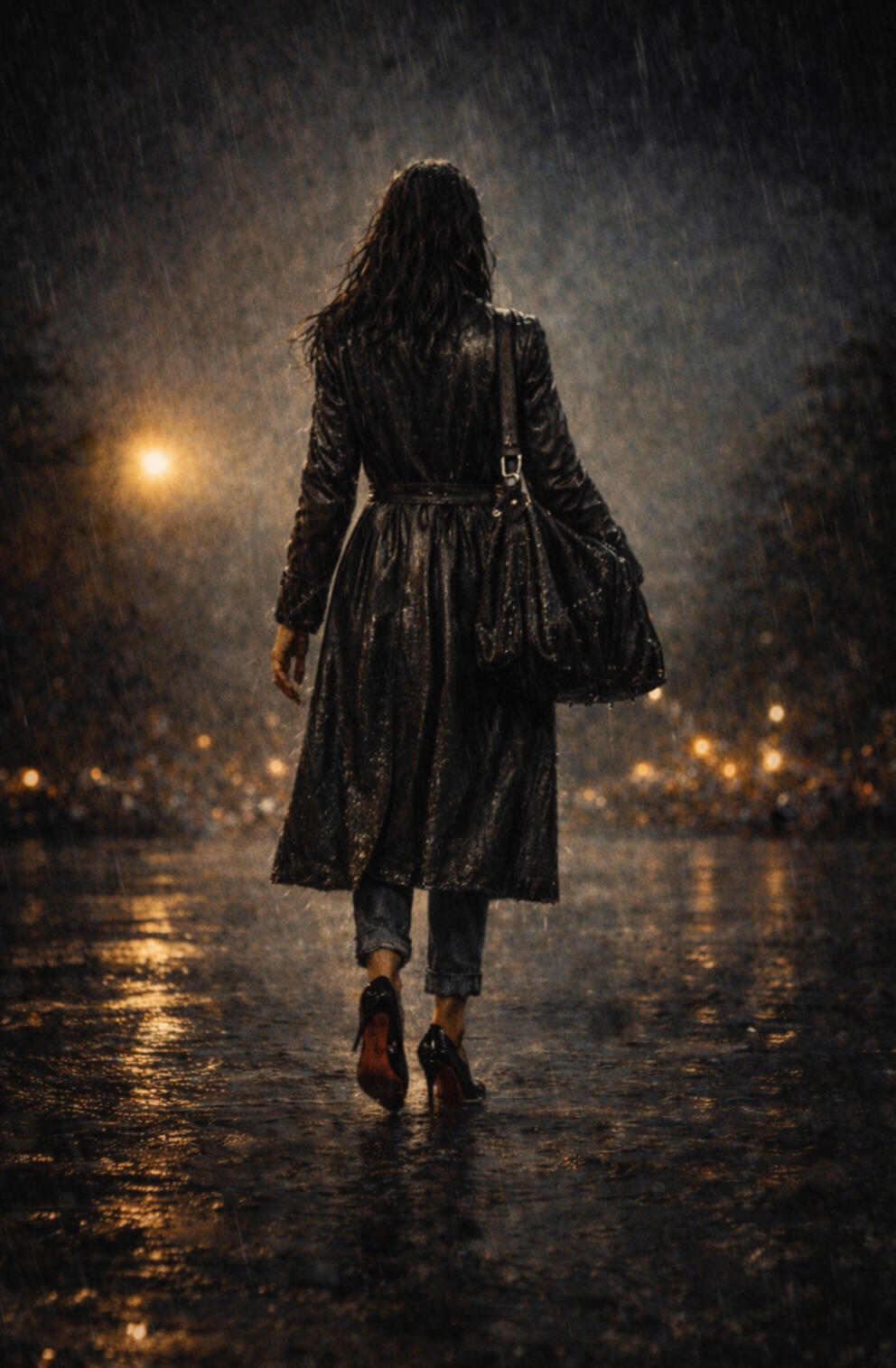 This was a hand-drawn and painted sketch that gradually grew into this finished work. The rain arrived late, but that then became the eponymous main subject. In my head, her walk reminds me of Paul Morel in the last page of Sons and Lovers as he walks towards the lights of the town.