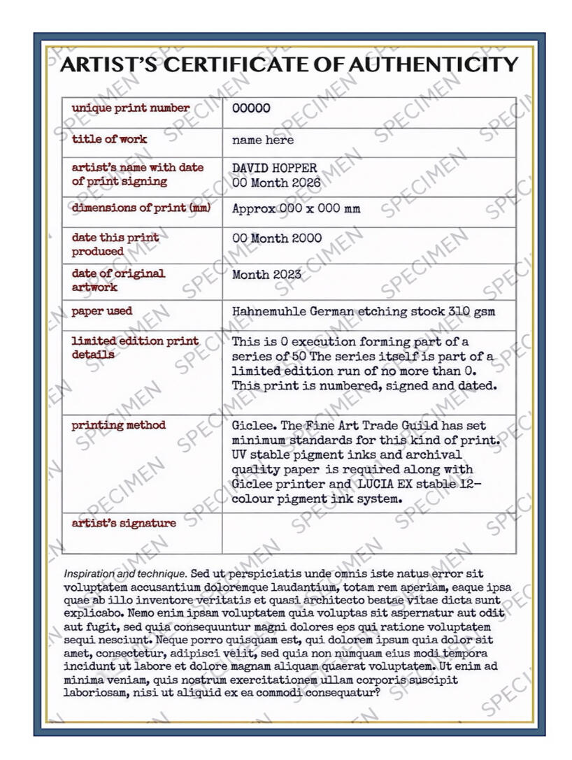 Most of my works are released as strictly controlled limited editions (signed and numbered by me) not posters or mass-produced décor items. They are unusual and rewarding artworks, created with care, intention and long-term preservation in mind. Certificates of authenticity are issued as part of the sale.
