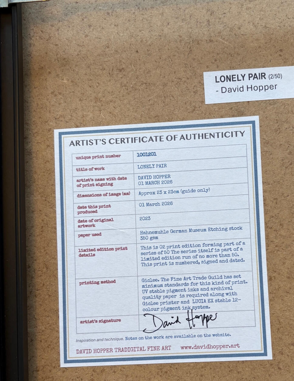 There are three elements signed in graphite at the foot of each print: edition detail; my signature (initials); and then date of issue. Plus Certificate of Authenticity signed in ink and attached to the back of the item.