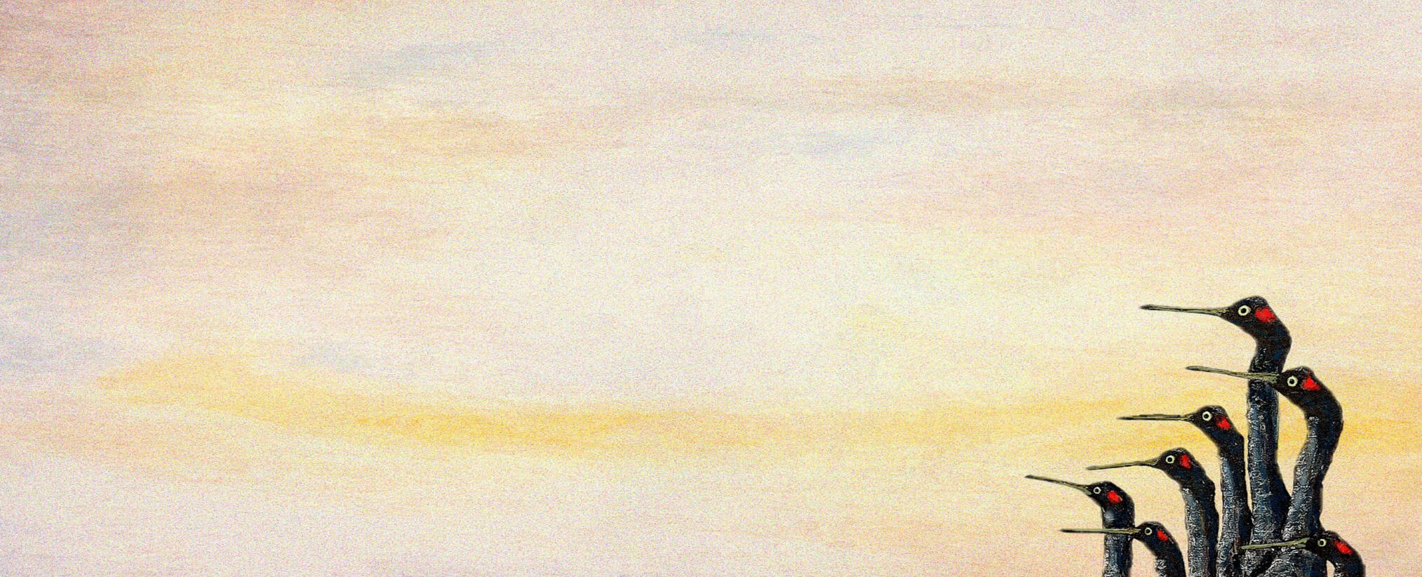 The inspiration for this work came from a fairly well-circulated Japanese meme image of cranes looking sideways. However, as you can see from some of my other works, I am fascinated by wide empty space and how this can create unanswered questions about nature and epistemological philosophy. I set about creating a group of quasi-cartoonish birds (species unspecified) who look to be somewhere between baffled and aware of something we can't see - perhaps something numinous or extra-worldly. I thought of putting a Space Odyssey obelisk far left but then decided that would be over-egging things. Indeed, the power of the scene probably comes from the vast unexplained emptiness on the left that yet manages to occupy the flock - they see what we can't.